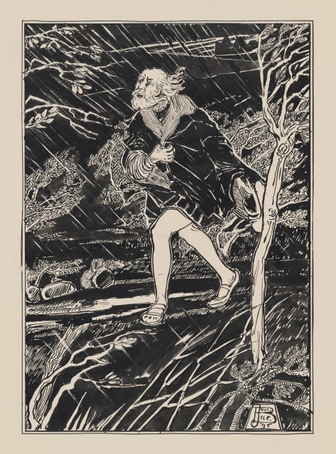 I marvel at the simplicity of you can never say it’s the worst as long as you can say it’s the worst as a piece of humor. Hard to imagine that it could be humor, given that it shows up in one of the unfunniest moments in King Lear, but Shakespeare is good for it. Edgar has just caught sight of his father, Gloucester, who had wronged him over nothing and rendered him a fugitive in his own country. Much has happened since then. Gloucester has been blinded by guests in his own house, and the way he has been blinded defies the English language—his eyes are not quite “clawed out” or “scooped out” or “put out.”